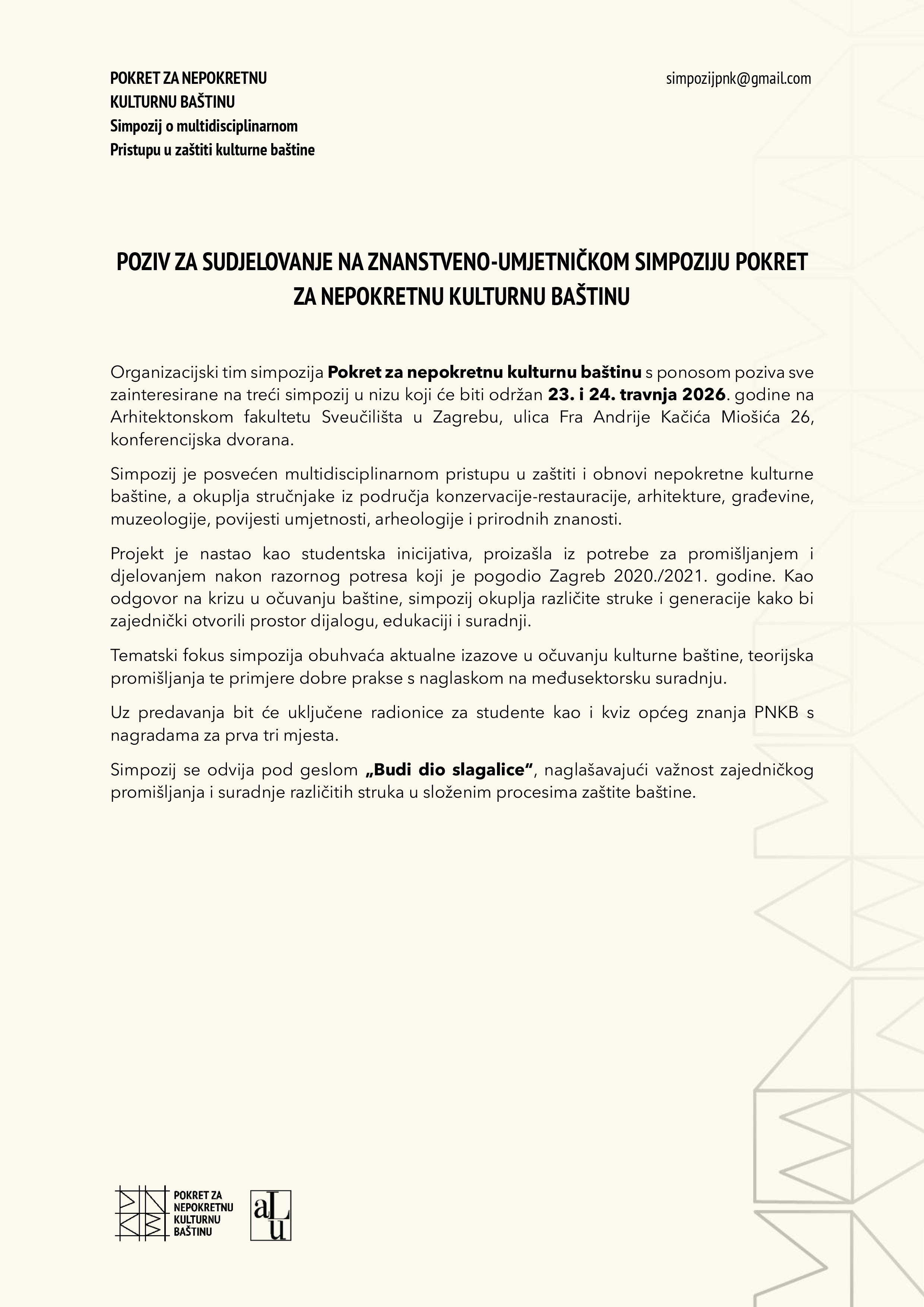 Pokret za nepokretnu kulturnu baštinu Vas poziva na treći znanstveno-umjetnički simpozij u nizu ‘Pokret za nepokretnu kulturnu baštinu‘, simpozij o multidisciplinarnom pristupu u zaštiti i obnovi.